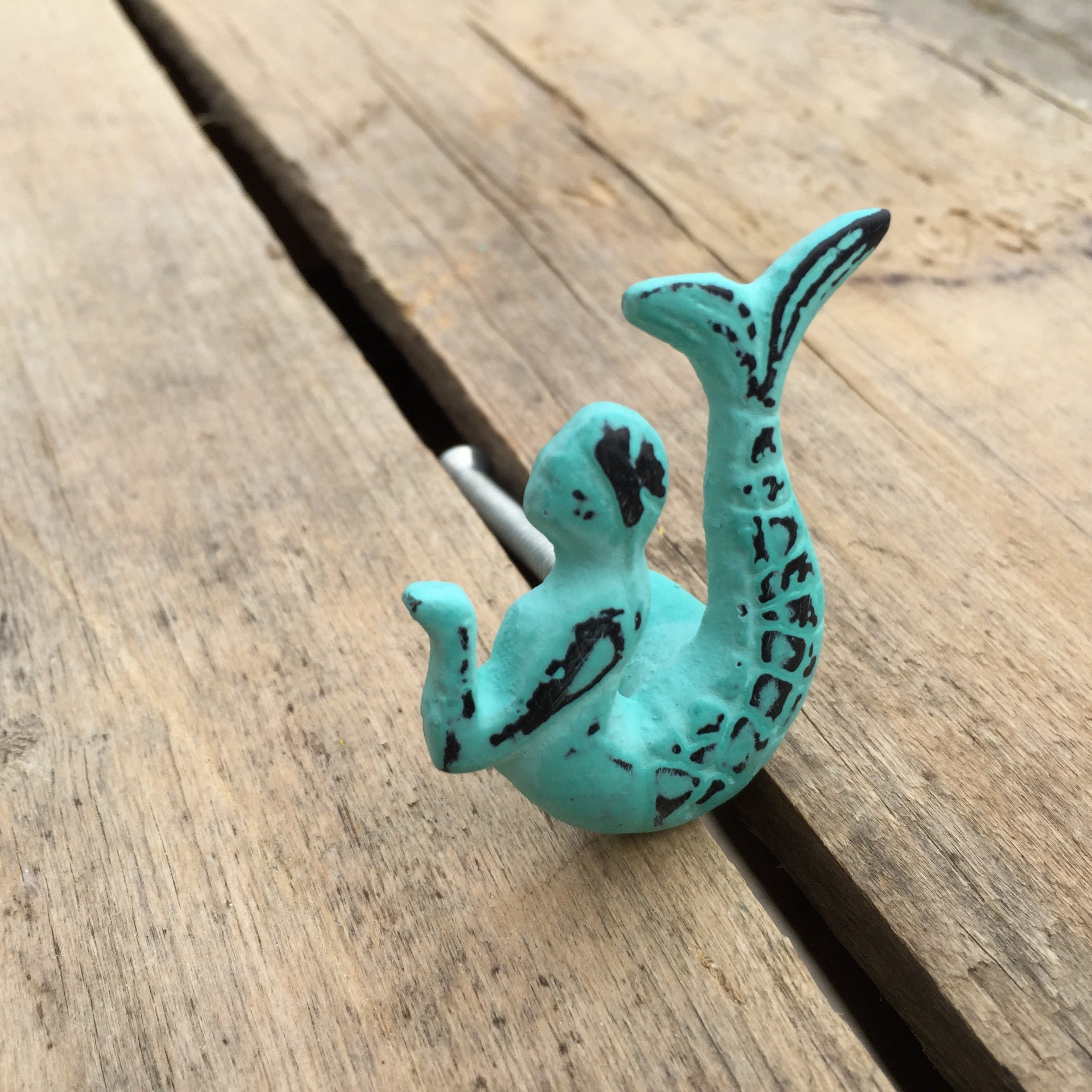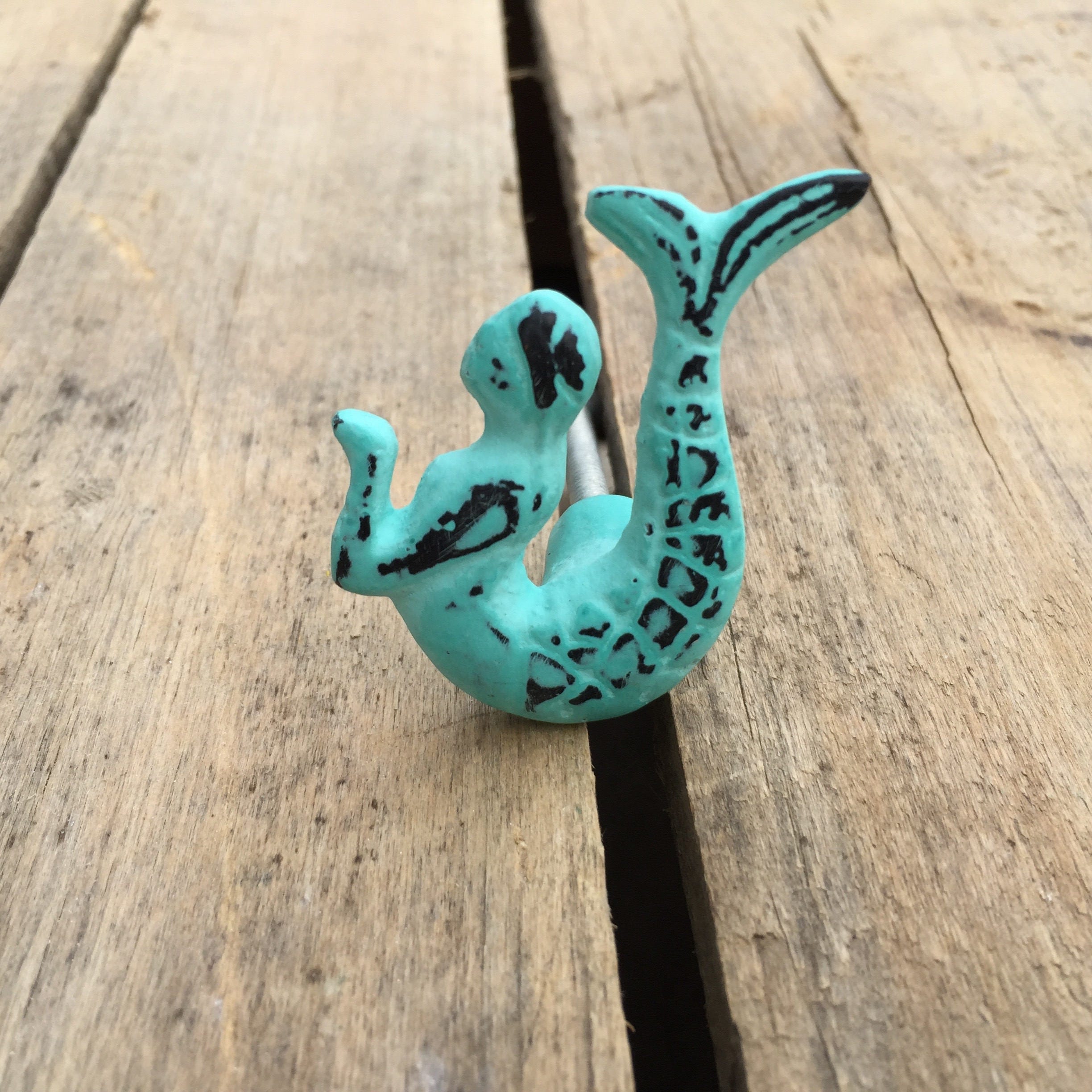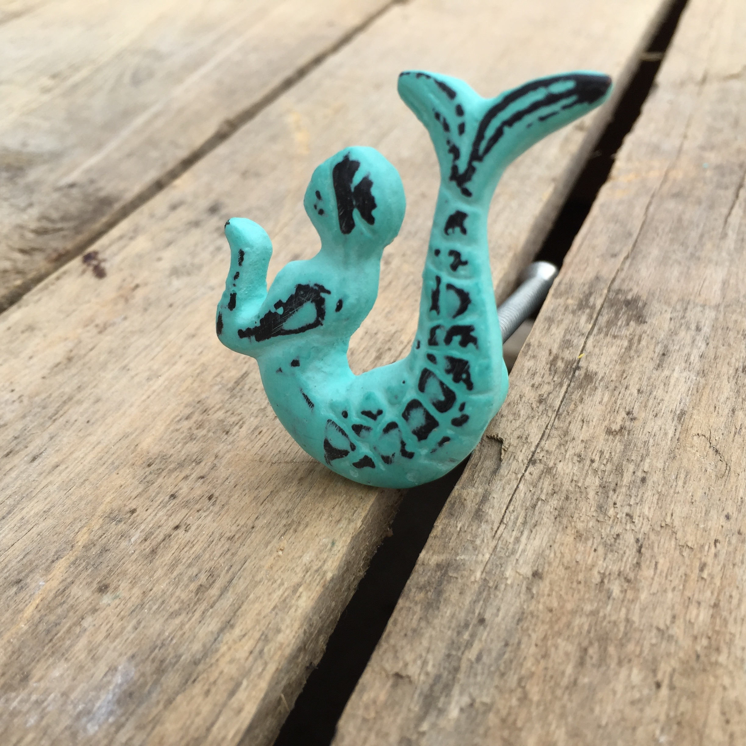 This cast iron mermaid drawer knob is finished in a beautiful distressed turquoise colour. Perfect for a Kid's room or bathroom.